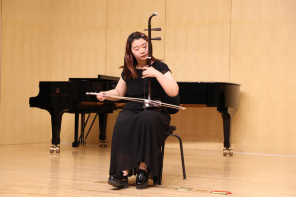 接下来是笙独奏《微山湖船歌》,演奏者是研究生二年级的刘立昊。刘立昊同学从“滥竽充数”的故事讲起,介绍了这件具有三千年历史的中国传统乐器——笙,并进行了精妙绝伦的演奏。