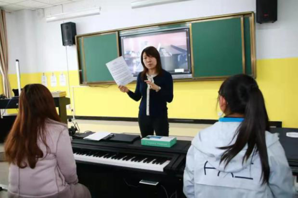 音乐教育学院骨干教师、学生团队共14人走进青海,对县音乐教师、群科新区中学、化隆第一中学的师生共200多人进行师资培训。26日上午,陈谊书记带领第一小组深入群科新区中学实地考察调研,并向学校赠送了音教师生党员捐款购置的谱架和尤克里里。音乐教育学院通行e的三位教师为化隆新区中学特色班学生及全县音乐教师进行了一上午的培训与交流:刘凯老师为群科新区中学特色班学生讲授体态律动的原理与方法,并为全县音乐教师讲授体态律动在音乐教学中的应用;伍龙轩老师为全县音乐教师进行键盘视奏培训,姚瑶老师为群中学特色班科学生进行歌唱教学的培训,三位老师从各自专业角度出发,对当地的师生做出了有针对性的培训并对其提出的问题做了细致解答和悉心指导。