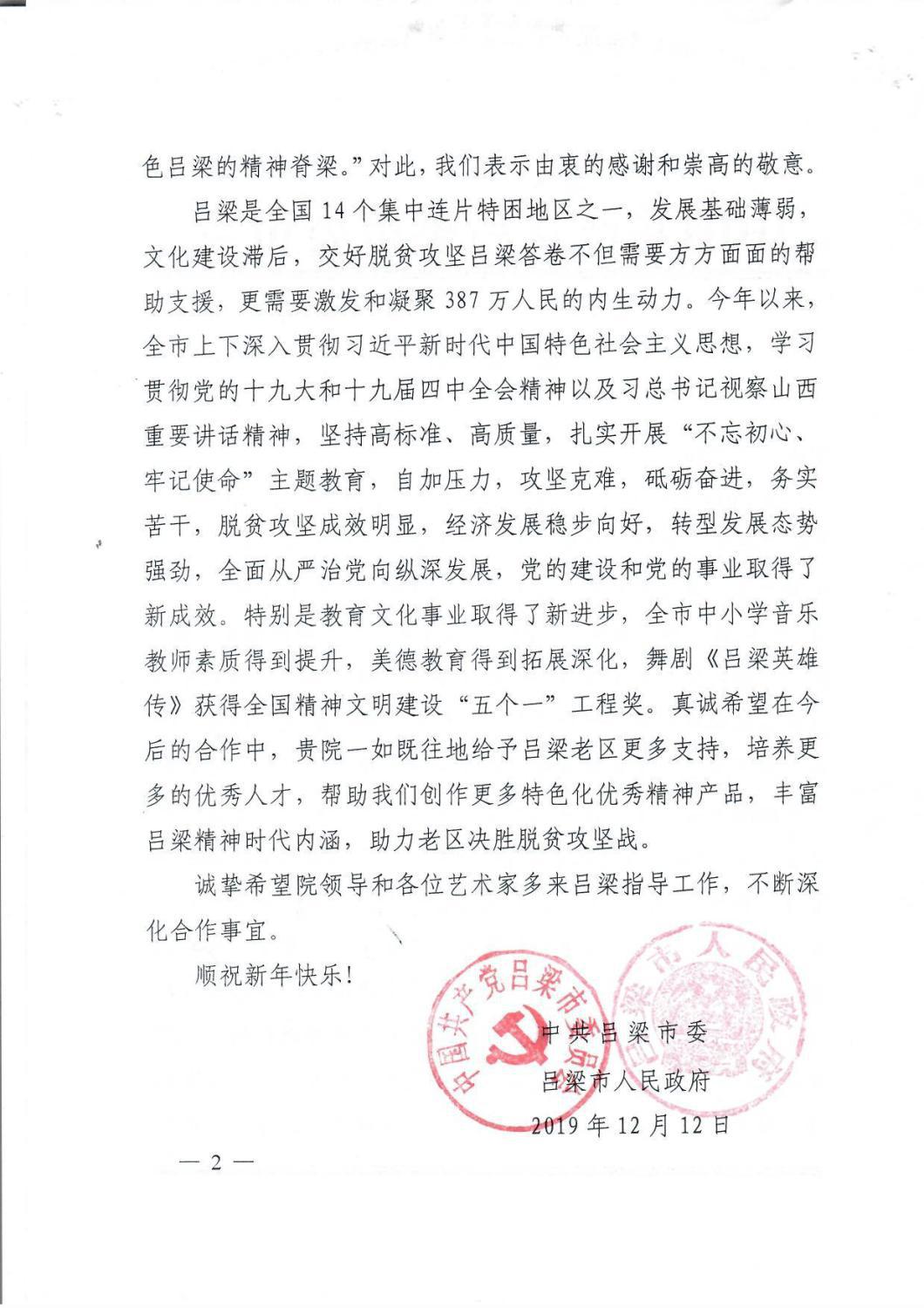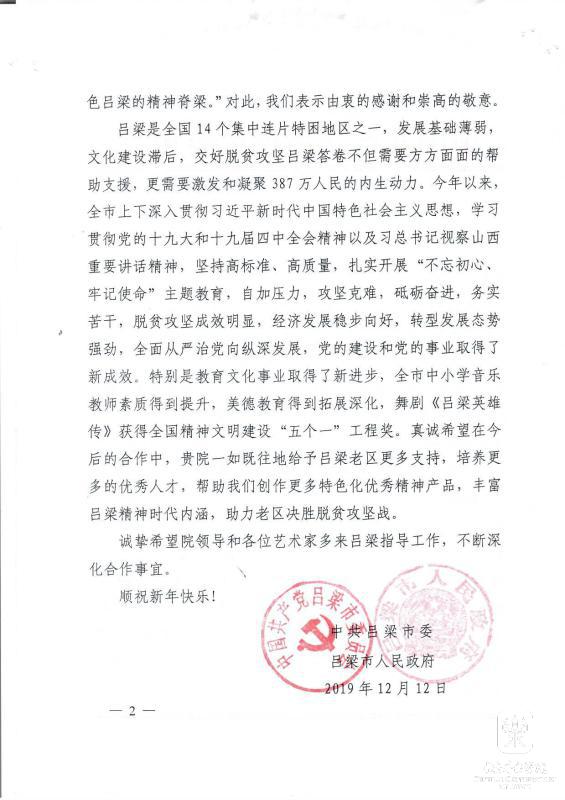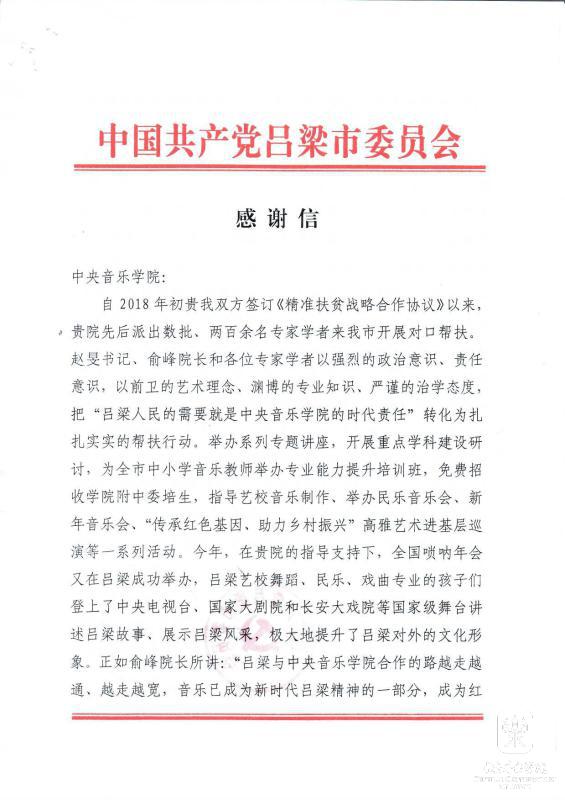 最近,中共吕梁市委员会、吕梁市人民政府特向我校发来感谢信,致以诚挚的谢意!相信在我校不遗余力地帮扶下,定会为吕梁老区培养更多音乐人才,留下宝贵艺术文化财富,助力老区打赢打好脱贫攻坚战,为全面建成小康社会做出新的更大贡献。