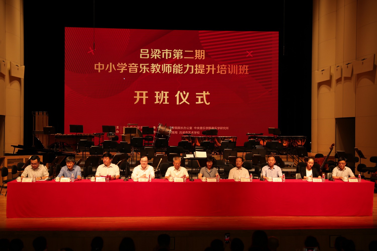 开班仪式在歌剧音乐厅举行。教育部体育卫生与艺术教育司副司长万丽君、山西省政协副主席、吕梁市委书记李正印,我校党委书记赵旻,院长俞峰,吕梁市委常委、市委秘书长李小明,教育部体卫艺司副处长陈蓓蓓,吕梁市政府副市长李俊平,我校音乐学研究所所长贾国平,吕梁市艺术学校校长杨志明出席,仪式由院长办公室赵海主持。