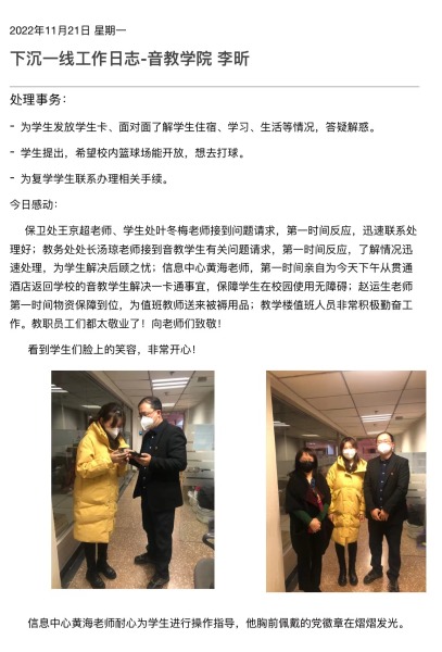 老师要用真心、爱心和耐心给予学生最多的关心与陪伴,让他们在学校安心无忧地学习!作为22级班主任,入驻学校陪伴学生的学习和生活,深感珍惜。期间,和学生一对一谈心交流,并通过网络视频或音频连线正在酒店健康观察的学生,了解其学习及心理状态、所需所求;每日在教学楼留守到最后,检查琴房锁门情况、提醒学生加强安全意识、排查安全隐患;在学校核酸检测点,监督秩序,提醒学生注意距离、合规佩戴口罩;在食堂,了解学生的餐食配给、口味与种类,提醒学生保持安全距离、隔开就坐或打包带走,尽可能减少不必要的接触,保障安全空间;在校园里,迎接健康观察结束后返校的学生,陪伴他们一起回宿舍、一同到教学楼。点点滴滴都是美好难忘的回忆!