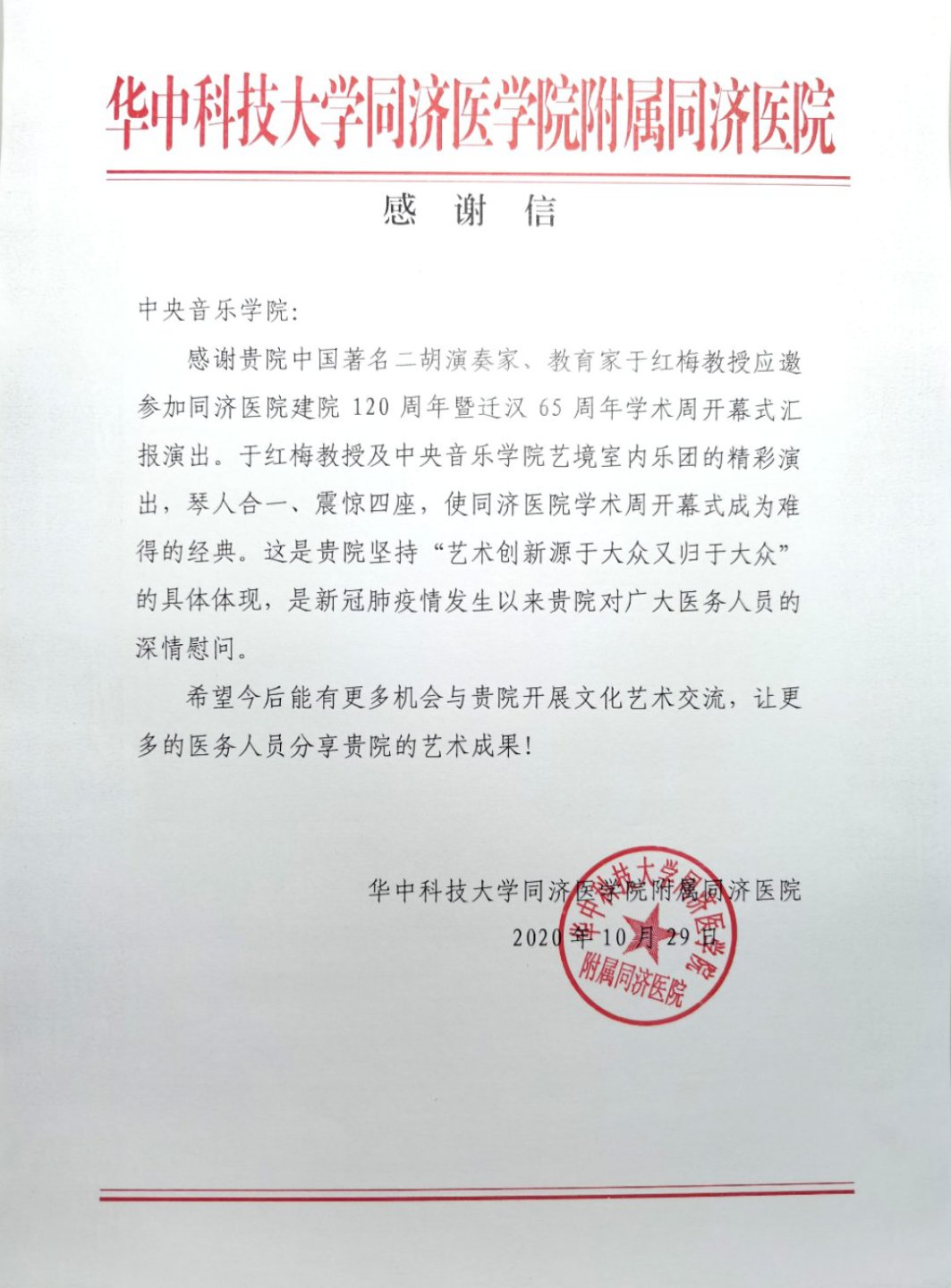 于红梅教授在致辞中讲到:“非常荣幸带领星空彩票ios版中心版师生参加同济医院建院120周年庆典,祝同济医院120岁生日快乐!我谨代表星空彩票ios版中心版向全体奋战在武汉的白衣天使和抗疫英雄们致以崇高的敬意,你们辛苦了!同时也将最美好的祝福寄托于我们的琴声,祝愿所有医护人员身体健康,工作顺利,生活幸福;祝福我们的祖国国富民强、国泰民安!”