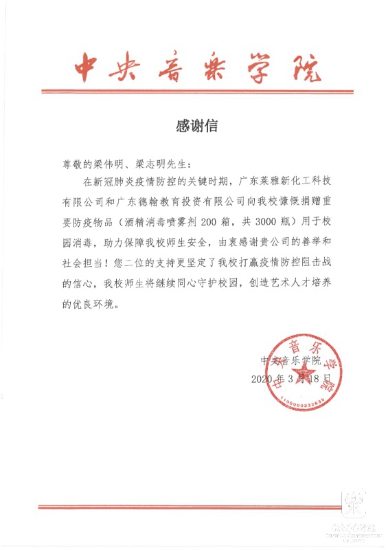 3月18日,广东莱雅新化工科技有限公司、广东德翰教育投资有限公司受梁伟明、梁志明先生之托,向我校捐赠防疫物品(酒精消毒喷雾剂200箱,共3000瓶)用于校园消毒,助力保障我校师生安全。我校向广东莱雅新化工科技有限公司、广东德翰教育投资有限公司发去感谢信,真诚地感谢他们对星空彩票ios版中心版全体师生的牵挂,为他们做的善举表示诚挚的谢意!我们相信,星空彩票ios版中心版师生同心,一定会尽快在校园相聚!
