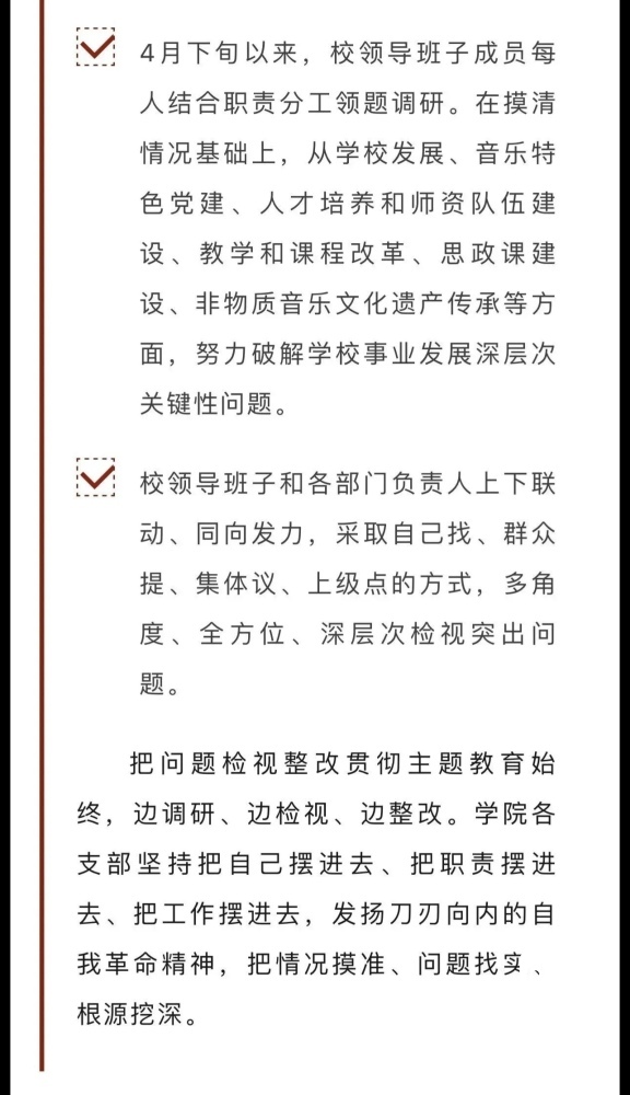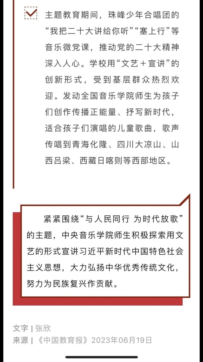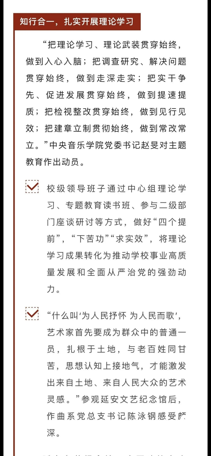 赓续红色血脉,以美育人培根铸魂。自主题教育开展以来,星空彩票ios版中心版结合学校实际积极创新方式方法和活动载体,形成高质量党建引领高质量发展的鲜明导向。学校始终坚持以培养社会主义音乐艺术事业需要的德艺双馨高层次音乐专业人才为目标,坚持思想引领与艺术传授并重,坚持社会主义的办学方向,以文化人、以文育人,构建“大思政”育人格局,着力营造浓厚的育人氛围。