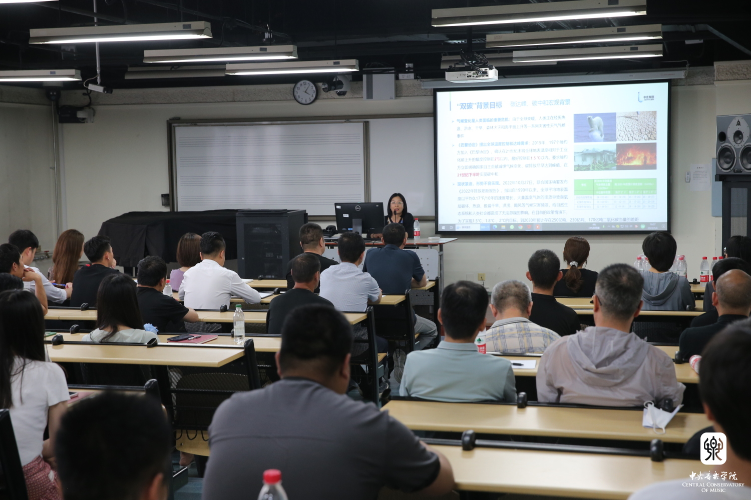 为深入贯彻落实习近平生态文明思想,厚植绿色发展理念,进一步做好“绿色学校“创建工作,结合”星空彩票ios版中心版绿色学校创建工作方案“的整体工作安排,我校于7月6日邀请中竞同创能源环境科技集团高级工程师宋建华在教学楼401举行了一场题为“双碳背景下高校节能减碳工作探讨“的讲座。我校各职能部门教职员工聆听了讲座。