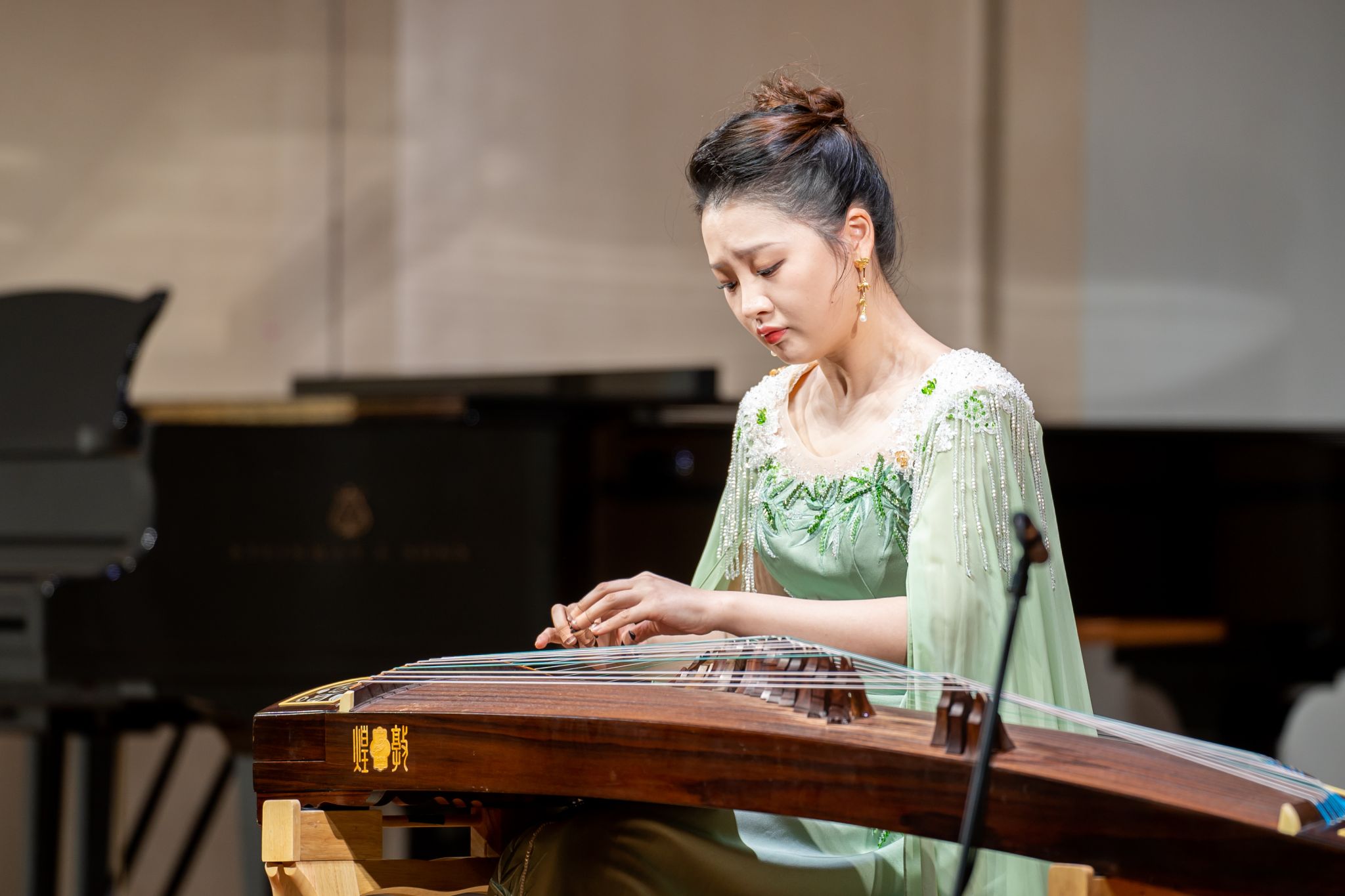 山中流泉,奔流入海。古筝专业硕士一年级学生王钰(师从周望教授)演绎的《林泉》由叶小纲作曲,充分融合传统音乐的曲式结构与西方音乐的创作思维,通过摇指、刮奏、撮弦等演奏形式,挖掘传统乐器的无穷潜力,架构“高远、深远、平远”的境界追求。