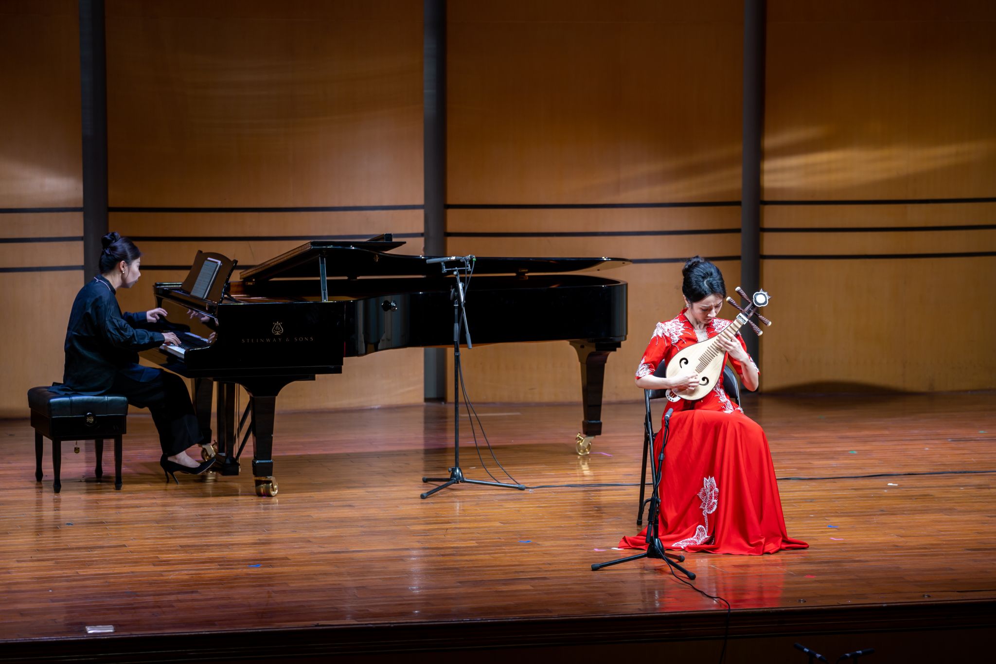这曲由扬琴专业博士二年级学生冯汝媛(师从刘月宁教授)演奏的《瑶山夜画》,以抓弦等现代技法展现月下相会的深情场面,以快速轮竹等常规处理描绘载歌载舞的欢快场景,以反竹等特殊技法演绎在“幻境”之中重归宁静。