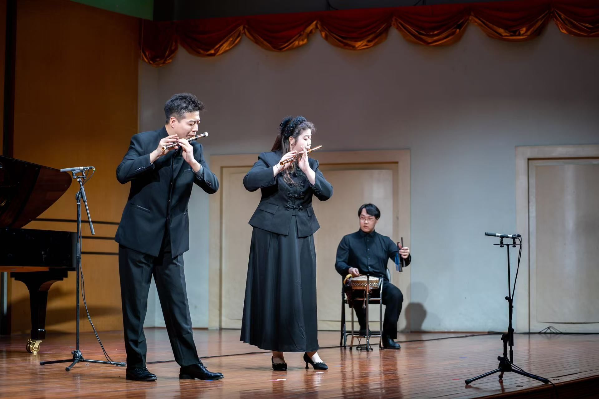 秦川八百展晨晖,翠影千重入目扉。由竹笛专业硕士一年级学生戴紫颐、王思奇(师从戴亚教授)演奏的《秦川情》,将原有独奏作品转化为重奏形式再度演绎,在二人收放自如的完美配合里,在腹震音、揉音等特殊技巧的细致处理中,在秦腔、碗碗腔等陕北风格的特性音调中,音乐以粗犷豪迈又不失细腻的姿态回荡在高低起伏之间。