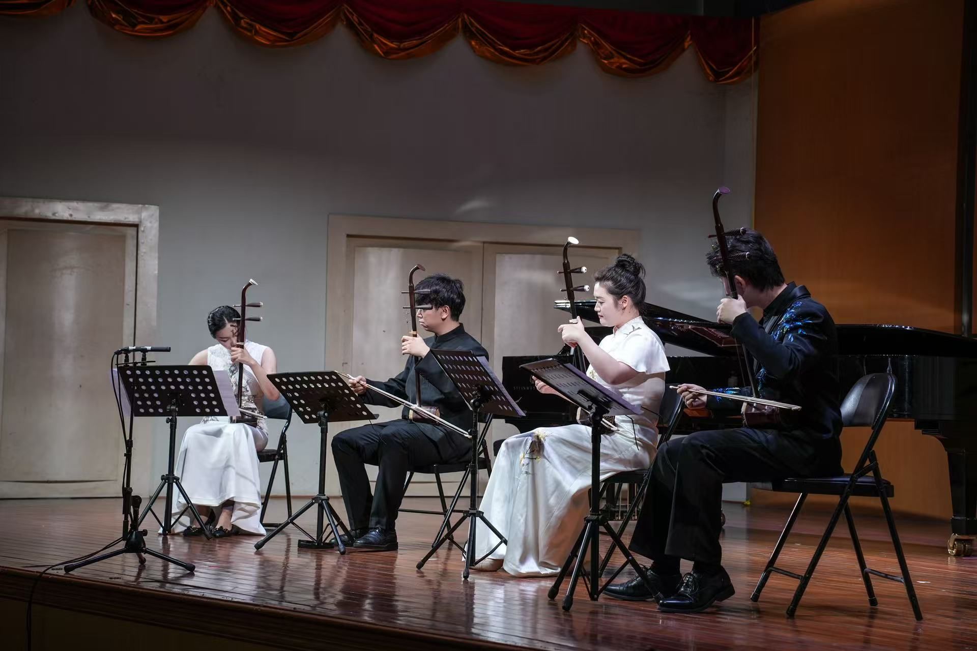 由阮专业本科二年级学生刘琦(师从邸琳老师)、本科一年级学生骆佳卉(师从邸琳老师)、硕士一年级学生薛淼(师从徐阳教授)、本科四年级学生康庭硕(师从徐阳教授)共同演奏的《山歌》,尝试打破固有的创作模式,大胆运用反传统式的弹挑技巧,以复调、和声等西方创作的理性思维,以旋律线条、节奏力度等传统创作的感性体验,描绘出山歌与美景在耳目间融汇的绚烂画面。