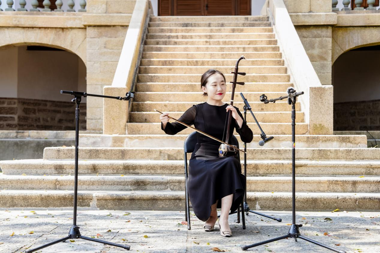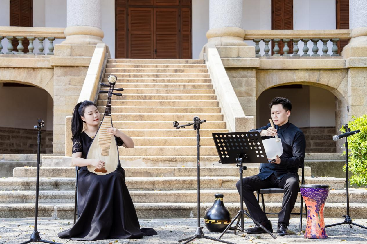 音乐会以琵琶独奏《静默之弦》拉开帷幕。演奏家以精湛的技艺拨动琴弦,琵琶的音色时而如珠落玉盘,清脆悦耳;时而如松涛阵阵,深沉悠远。打击乐则巧妙地运用水晶钵的余音缭绕、巫毒鼓的深沉回响与中东鼓的热情节奏为琵琶的旋律增添了更丰富的色彩。历史悠久的鼓浪屿八卦楼静静伫立,仿佛一位岁月的守望者,与流淌的民族音乐交织成一幅动人的画卷。